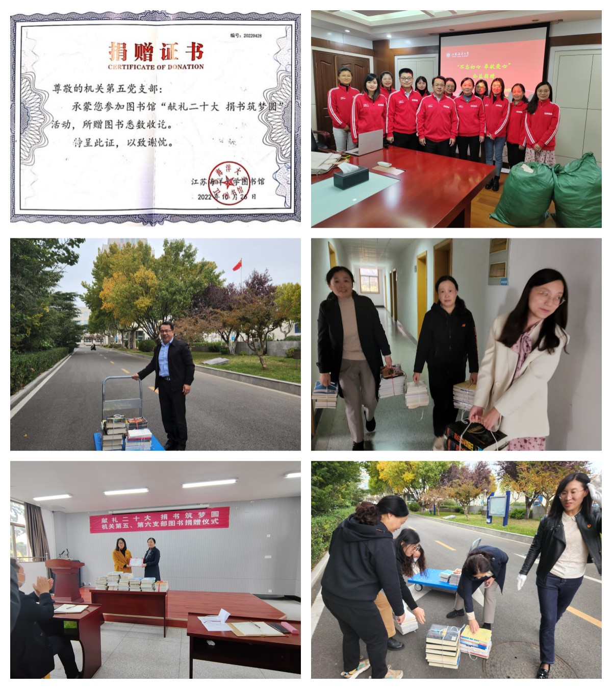 机关第五党支部联合机关第六党支部积极参与学校第四届读书节中的“献礼二十大,捐书筑梦圆”活动;10月27日下午,在学校图书馆东302举行了捐赠仪式,并聆听图书馆王启云老师的专题讲座《如何利用图书馆资源与服务助力职业能力提升》;另外,党支部还开展了捐助贫困群众冬衣活动,为四川甘孜贫困群众送温暖。