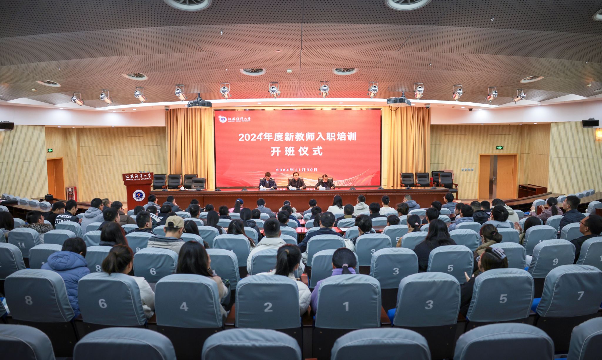 11月30日上午8:30,培训开班仪式在会议中心黄海厅举行,人事处处长蒋廷臣主持开班仪式。在开班仪式上,校党委常委、副校长徐军田作了培训动员讲话。他强调新教师要以本次培训为契机,树立正确的理想信念和价值观,学习先进的教育思想和教学理念,养成良好的职业道德和敬业精神。同时对新入职教师提出了四点期望:一要以德治教,加强修养;二要身先垂范、勇于担当;三要终身学习,持之以恒;四要精心规划,成就梦想。
