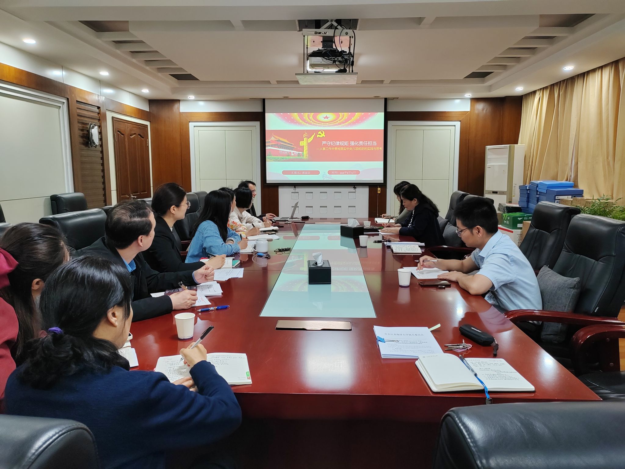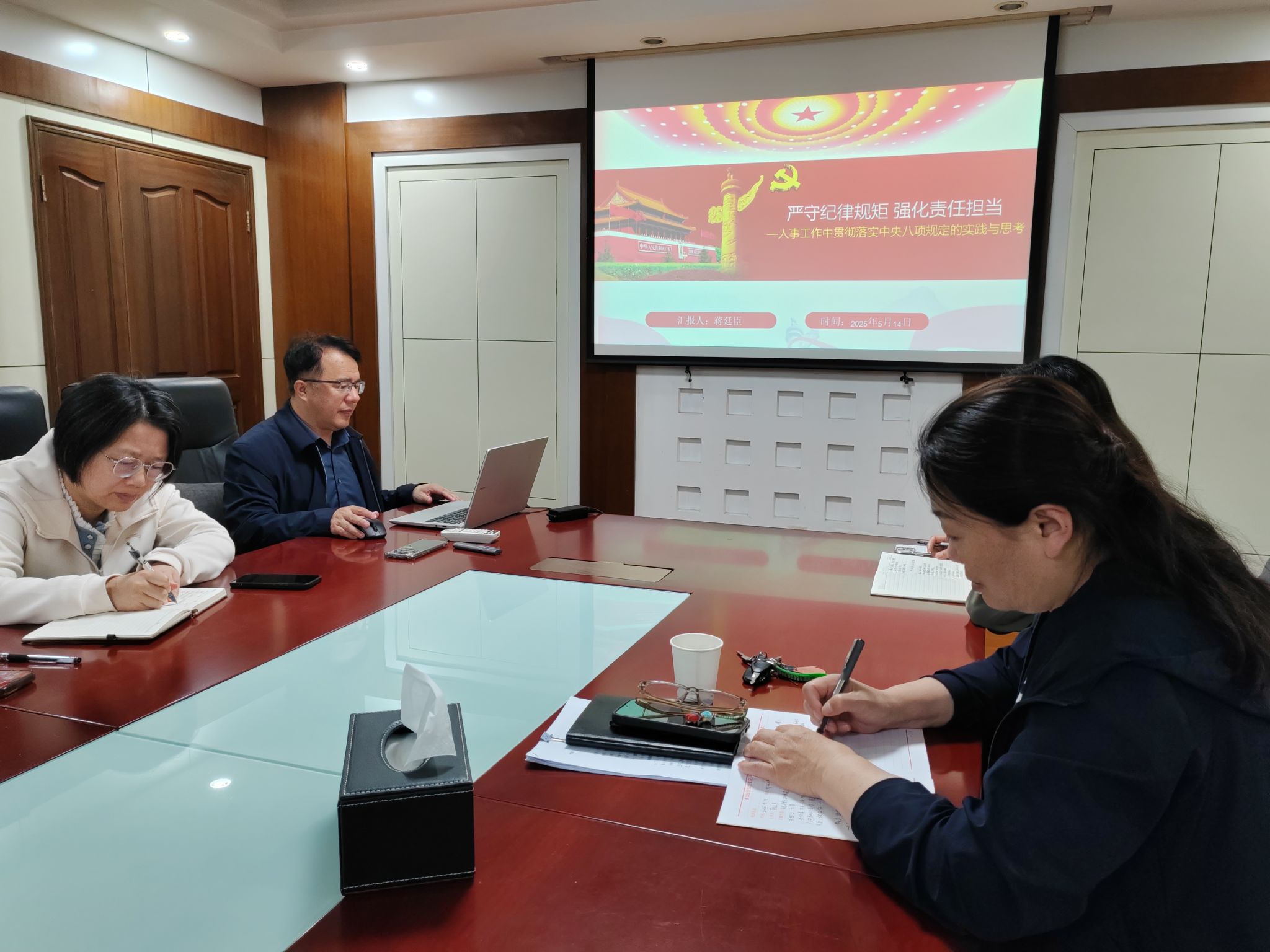 为深入贯彻落实习近平总书记关于加强党的作风建设的重要论述,进一步学习领会中央八项规定及其实施细则精神,5 月 14 日上午,人事处党支部在行政楼二楼会议室开展“严守纪律规矩 强化责任担当”专题党课活动。党支部书记蒋廷臣讲授党课,人事处党支部全体人员参加活动。